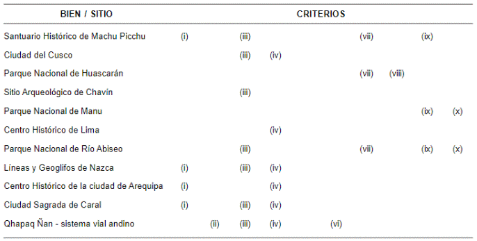 En el caso del Perú, se han aprobado declaraciones retrospectivas del valor universal excepcional para la Ciudad del Cusco, el Santuario Histórico de Machu Picchu, el Sitio Arqueológico de Chavín, el Parque Nacional de Huascarán, la Zona Arqueológica de Chan Chan, el Parque Nacional del Manu, el Centro Histórico de Lima, el Parque Nacional del Río Abiseo, las Líneas y Geoglifos de Nazca y Palpa y el Centro Histórico de Arequipa.