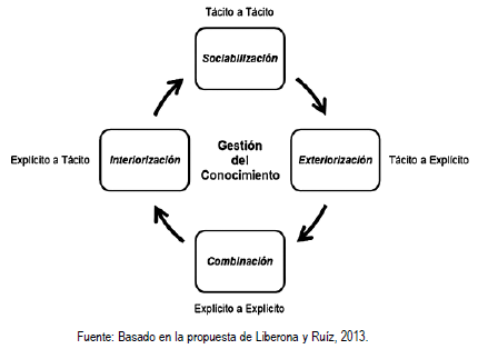 Para Liberona y Ruíz (2013), la capacidad de convertir el conocimiento tácito en explícito, compartirlo y utilizarlo dentro de la empresa le generará ventajas competitivas. Tal capacidad se manifiesta en cuatro formas de conversión de conocimiento (Figura 1):