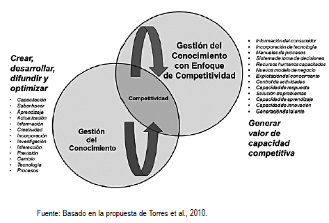 Para ello, Torres et al., proponen la creación de una «organización inteligente» (2010), capaz de crear, desarrollar, difundir y optimizar el conocimiento para generar valor en su capacidad competitiva. En otras palabras, una empresa que sepa fomentar el aprendizaje que incentive a compartir conocimiento y experiencia dentro de ella y manifestarlo hacia el exterior en forma de competitividad (Figura 2).