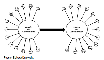 Se utilizó ecuaciones estructurales como método para conocer y analizar la relación entre la gestión del conocimiento y la competitividad. Sobre la base de estos modelos y los aspectos identificados en la revisión de literatura, se aplicó el cuestionario piloto basado en la propuesta de Torres et al. (2010). Posteriormente se diseñó un modelo estructural, donde se exploraron las dos variables de interés, así como las diferentes dimensiones consideradas en el instrumento correspondiente a cada una de ellas. Los detalles de este modelo se pueden apreciar en la Figura 3.