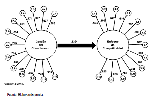 En la Figura 4 se representan los resultados obtenidos en esta prueba piloto dentro del modelo estructural de gestión del conocimiento y el enfoque de competitividad. Se puede apreciar que el constructo denominado gestión del conocimiento es afectado de una manera positiva y significativa por el enfoque de competitividad.