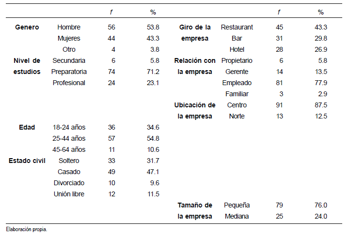 Participaron propietarios, familiares, gerentes y empleados que estuvieron involucrados directamente en los procesos de gestión de las empresas, en total, 18 empresas familiares turísticas identificadas (restaurantes, bares y hoteles) de Guanajuato (Tabla 1). Para determinar el tamaño de la muestra necesaria para esta prueba piloto, se utilizaron los criterios propuestos por de Hair, Black, Babin y Rolph (2010), quienes sugieren una cantidad de 4 instrumentos aplicados por cada ítem del cuestionario. De acuerdo con lo anterior, se recolectaron un total de 104 cuestionarios.