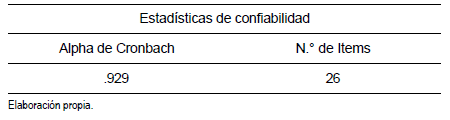 Para determinar la validez del cuestionario, de acuerdo con Lévy y Varela (2003), se realizó un piloteo de 104 aplicaciones del cuestionario. El alpha de Cronbrach de esta muestra obtuvo un índice de .929, el cual es mayor al .70 que sugieren Hair et al. (2010) como un índice mínimo de validez (Tabla 2).