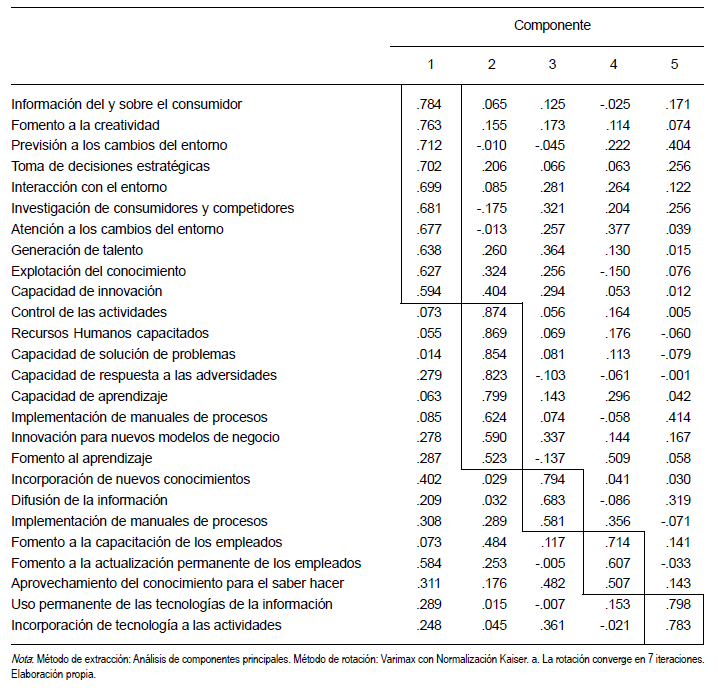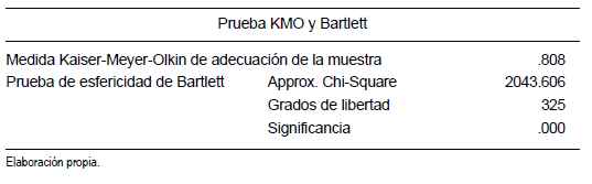 La información recolectada se analizó con el software de análisis cuantitativo Statistical Program for the Social Sciences, SPSS. Se corroboró lo adecuado de la muestra para realizar un Análisis Factorial Exploratorio (AFE), mediante la prueba de Kaiser-Meyer-Olkin y la prueba de esfericidad de Barlett (Tabla 3), así como el método de rotación Varimax para mejorar el entendimiento de la matriz de correlaciones (Lévy & Varela, 2003).