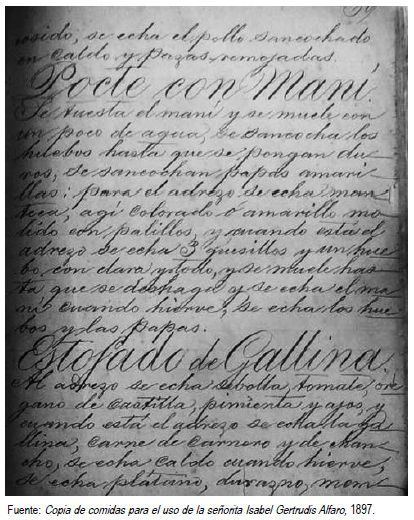 Una serie de comidas tradicionales españolas por un proceso de mestizaje dieron lugar a otras nuevas, peruanas, por ejemplo: migas, cordero verde, escabeche, chanfaina, salpicón, picadillo, cocido español, adobo, buñuelos de viento, arroz con leche y turrón. Para los correspondientes platos criollos: ají de gallina, seco de carnero, lomo saltado, chanfainita, salpicón, pastel de choclo, sancochado criollo, anticuchos, picarones, arroz con leche y turrón de doña Pepa. Esta relación de recetas criollas las encontramos entre otras que suman 119, es decir algo más del 38% del total de recetas del manuscrito. De estas, diez son recetas originales, que no hemos podido ubicar en otros recetarios o manuscritos anteriores o posteriores al que estudiamos aquí. Esta influencia española es fundamental para entender la cocina peruana, así como la presencia de una cocina prehispánica que en conjunto forman la base formativa de la cocina nacional. En la cocina criolla uno de los platos más valorados es el ají de gallina, y precisamente en el manuscrito el «Picante amarillo de gallina» (Figura 4) es una receta original relacionada directamente con este plato: «Para el aderezo se echa ajos, pimienta, cebolla, perejil, orégano, ají molido con palillos; cuando esté cocido se echa la gallina sancochada en pedazos, caldo, pan remojado con nueces molido» (Alfaro, 1897). Comparativamente, una receta contemporánea lleva como ingredientes: aceite, cebolla, ajos, ají verde, pan «remojado en un poco del caldo» (Anónimo, 1975), leche, queso parmesano, nueces y gallina que se debe sancochar y deshilachar; también, papa, huevo y aceituna a manera de guarnición. Este plato consiste pues en carne de gallina cocida y deshilachada, mezclada con un ahogado que tiene por base ají, cebolla, ajos y al que se le agrega pan remojado, leche, queso y nueces. La relación con las migas está dada por el uso básico del pan, manteca y condimentos. Durante la República, a partir de las migas aparece el ají de pan, como una variación de este plato tradicional modificado. Por común denominador tenemos el pan remojado ya sea en caldo, leche o con mayor frecuencia en agua, para luego ser escurrido y formar parte del ahogado que previamente se preparó. Luego está la gallina o pollo, que una vez sancochado es deshilachado y añadido a la preparación del ahogado y pan. El nombre del guiso picante de gallina estuvo vigente hasta la primera mitad del siglo XX aproximadamente, siendo perfeccionada la receta (p. ej. con nueces molidas), pasando a denominarse ají de gallina. Otro caso de interés es el turrón (bizcocho) que en concordancia con la información del manuscrito, el nombre de turrón de doña Pepa surgiría en la primera década del siglo XX, con la descripción y hasta la fotografía del famoso dulce (Anónimo, 1908). Anteriormente se denominaba turrón de miel o simplemente turrón.