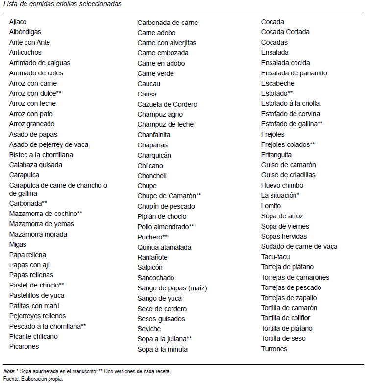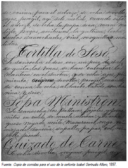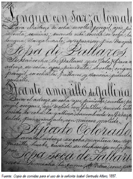 El cuaderno de Isabel Gertrudis Alfaro refleja un centenario mestizaje alimenticio por el intercambio entre la cocina española y la nativa regional, con supervivencia de platos prehispánicos. Asimismo, han sido incorporados ingredientes nativos y mestizos en las comidas regionales y criollas resultantes de ese proceso de mestizaje por el cual forman parte del patrimonio culinario (ver Tablas 1 y 2).