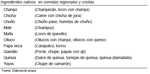 En el recuento de recetas encontramos varios ingredientes locales que, aparte del choclo y la papa, complementan el registro, como el olluco, chuño (papa congelada y secada naturalmente), papa seca (papa cocida y deshidratada), charqui, muña (Minthostachys mollis), yuyos, etcétera.