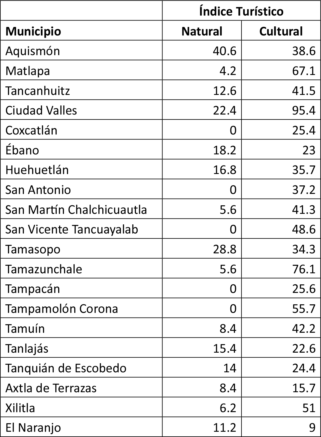 En la Tabla 1 se muestran los resultados de un estudio realizado para estimar la importancia del patrimonio turístico en la región huasteca, tomando como punto de partida la formulación de un inventario de recursos y la estimación de un índice de patrimonio turístico. (Reyes et al., 2012). En el estudio se puede apreciar que existen municipios como Aquismón y Tamasopo que destacan en patrimonio natural, mientras que otros como Ciudad Valles, Matlapa, Tampamolón Corona, Tamazunchale y Tamuín lo hacen en materia de patrimonio cultural.