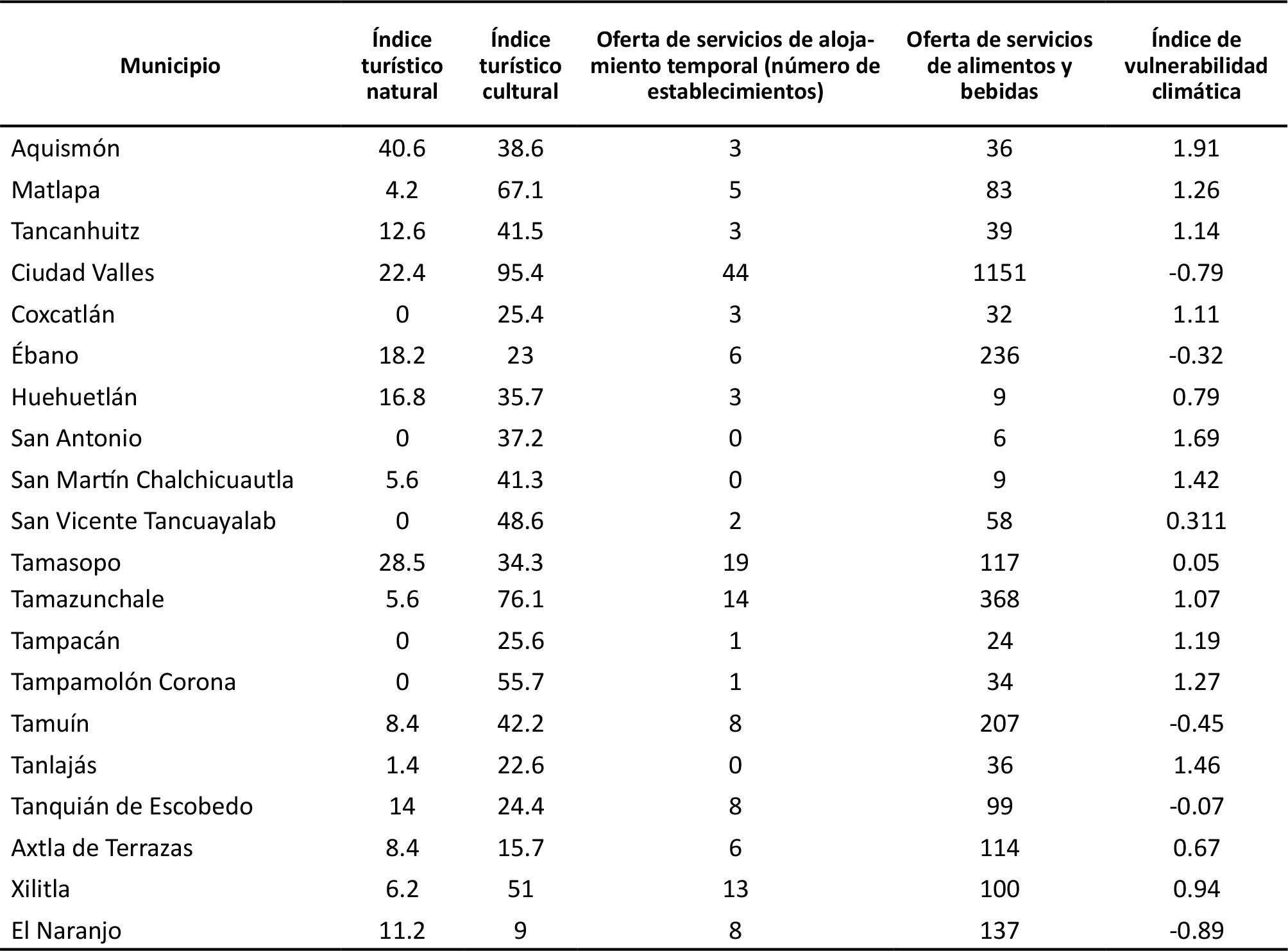 Índice turístico natural y cultural; oferta de servicios turísticos y vulnerabilidad al cambio climático en los municipios de la zona Huasteca Potosina
