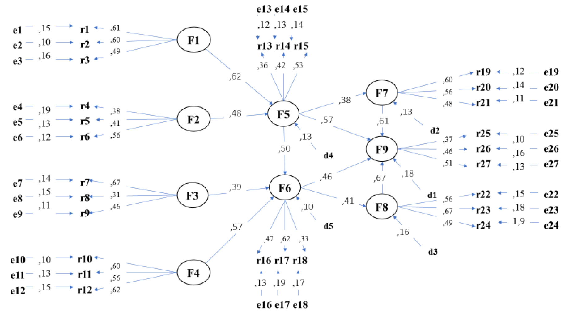 F6 = Facilidad, F7 = Reservación, F8 = Traslado, F9 = Estadía; r = reactivo, e = elemento de medición de error,