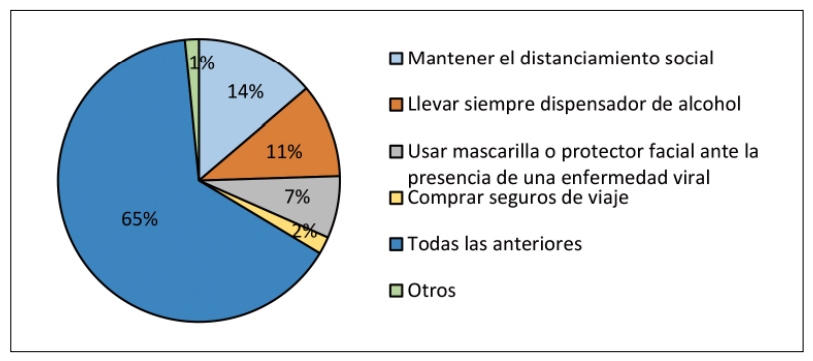 La anticipación, considerada una emoción positiva, se ve presente en los turistas trujillanos, y los incentiva a la búsqueda de alternativas seguras de viaje (Figura 20). Así lo indicaron 14%, mantener el distanciamiento social; 11%, llevar siempre un dispensador de alcohol; 7%, utilizar una mascarilla o protector facial ante la presencia de una enfermedad viral; 2%, comprar seguros de viajes; 65%, todas las acciones anteriores.