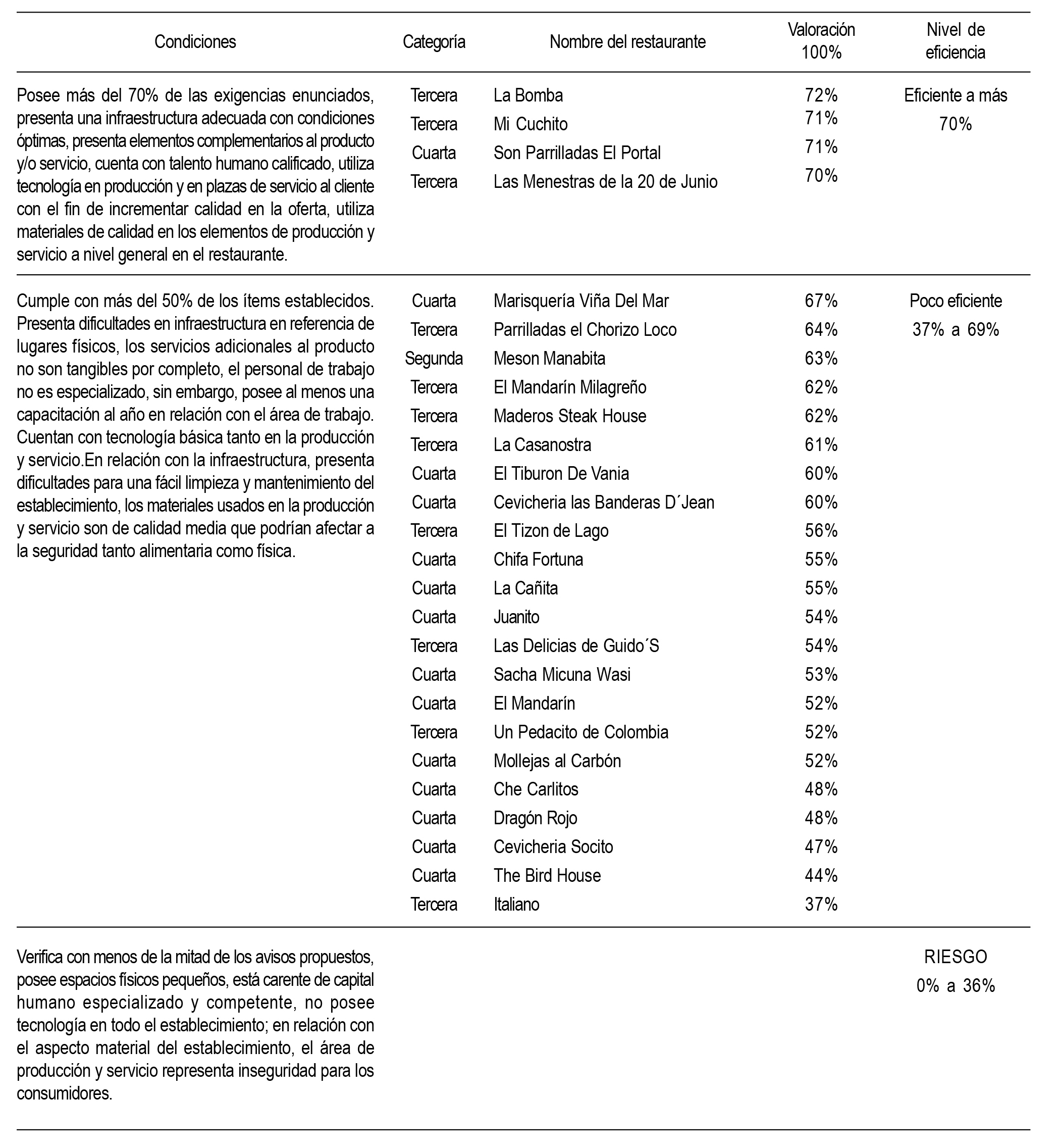restaurantes y entrevistas a consumidores. A partir de la evaluación individual se determina el nivel de eficiencia