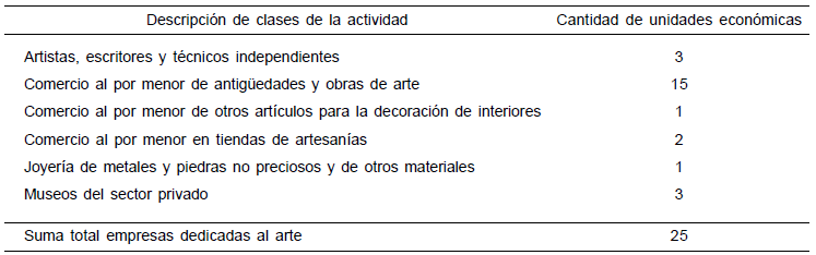 Se puede apreciar en la Tabla 3 y Figura 4 que la mayor concentración de unidades económicas se encuentra en el comercio al por menor de antigüedades y obras de arte, espacios que permiten la contemplación de las obras u objetos.