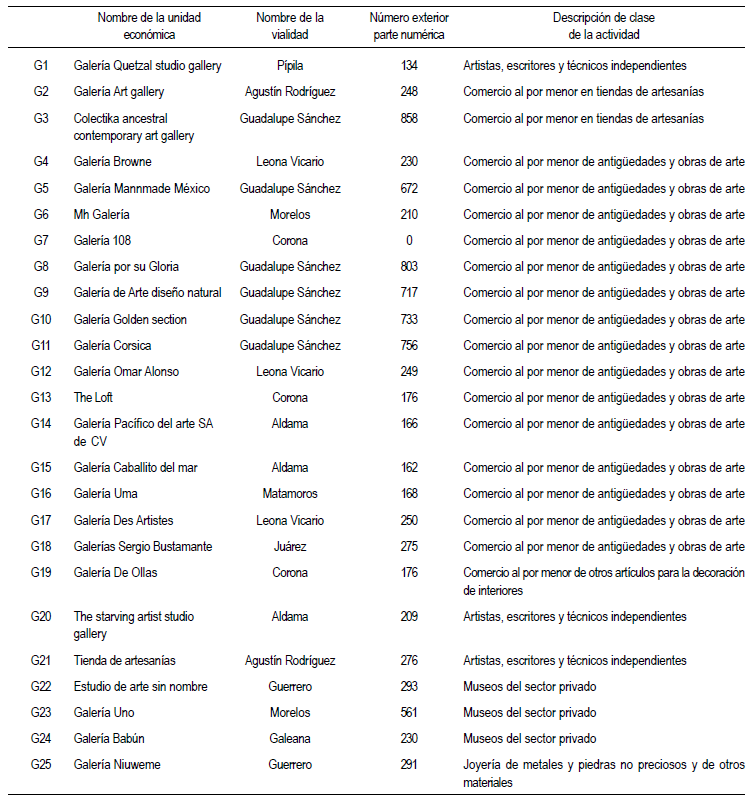 Las galerías de arte, como tal, no están clasificadas como actividades económicas dentro del censo del INEGI, sin embargo, se encontró que para el conteo de 2020 las actividades clasificadas para este tipo de negocios, son las actividades de comercio al por menor de antigüedades y obras de arte, dando como resultado en este polígono de estudio 25 unidades económicas, representadas en la Figura 5 donde se aprecia un sesgo metodológico por parte de DENUE en la categorización de las unidades económicas (INEGI, s.f. b).