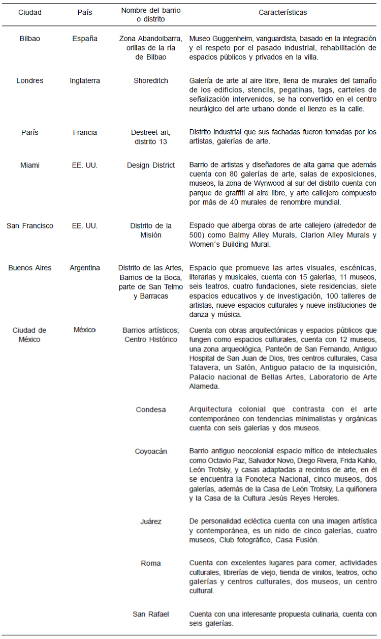 Así, diversas ciudades en el mundo, como Bilbao, Londres, París, y los distritos creativos como Miami, Buenos Aires y Ciudad de México, son ejemplo de que el arte es agente dinamizador e impulsor del desarrollo turístico; logrando un fortalecimiento que ha generado nuevas oportunidades de negocio, revitalización de zonas enteras, y una fuerte influencia en el posicionamiento de la marca turística de las ciudades donde se desarrolla.