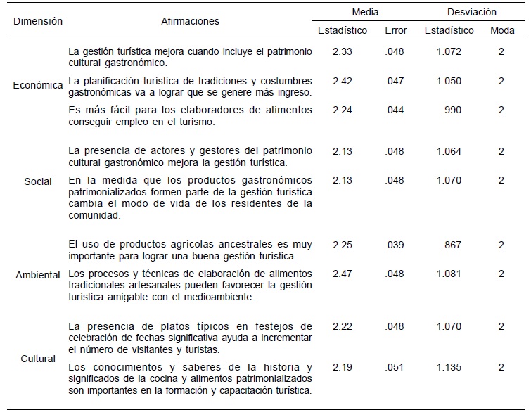En cuanto a la dimensión cultural (Tabla 1), la presencia de platos típicos en celebraciones y festividades aumenta el número de visitas y turistas. En promedio (2.22), se percibe de forma positiva, con una variación de .05 unidades y una desviación (1.13) distribuida en valores altos de la escala. Además, los conocimientos y saberes de la historia y significados de la cocina y alimentos patrimonializados son importantes en la formación y capacitación turística. En promedio, se valora positivamente (2.19), con una variación de .01 unidades y una desviación de 1.13 hacia los valores más altos de la escala, y categorizados como totalmente de acuerdo. Se concluye que existe una actitud positiva hacia el patrimonio cultural gastronómico en la gestión turística cultural.