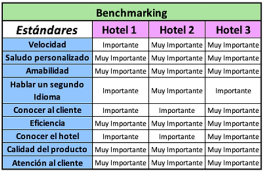 Posteriormente, con los datos recogidos, mediante un Benchmarking se realizó la comparación de los estándares que se identificaron anteriormente. Además, se analizó la información, para determinar las variables que afectan los estándares de calidad y servicio en estos hoteles. En función de lo hallado se plantean las recomendaciones que permiten cumplir los estándares de lujo que establece cada cadena para sus hoteles al prestar el servicio a sus clientes.