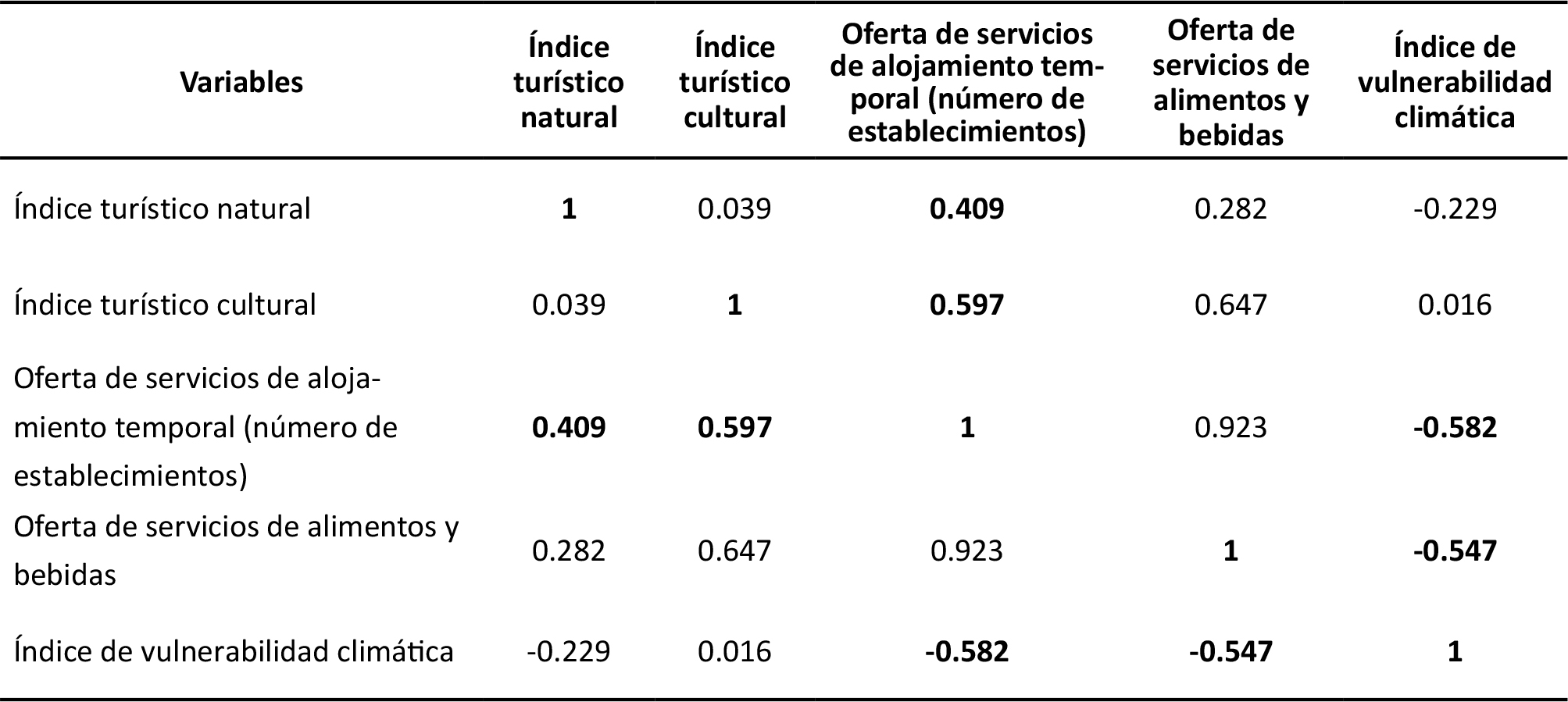 the eighteen municipalities in the area. Subsequently, the Pearson correlation indexes were calculated among the aforementioned variables, finding statistically significant relationships between the tourism offering and